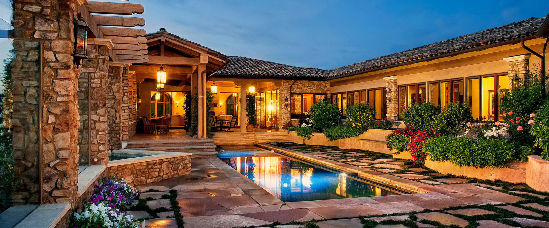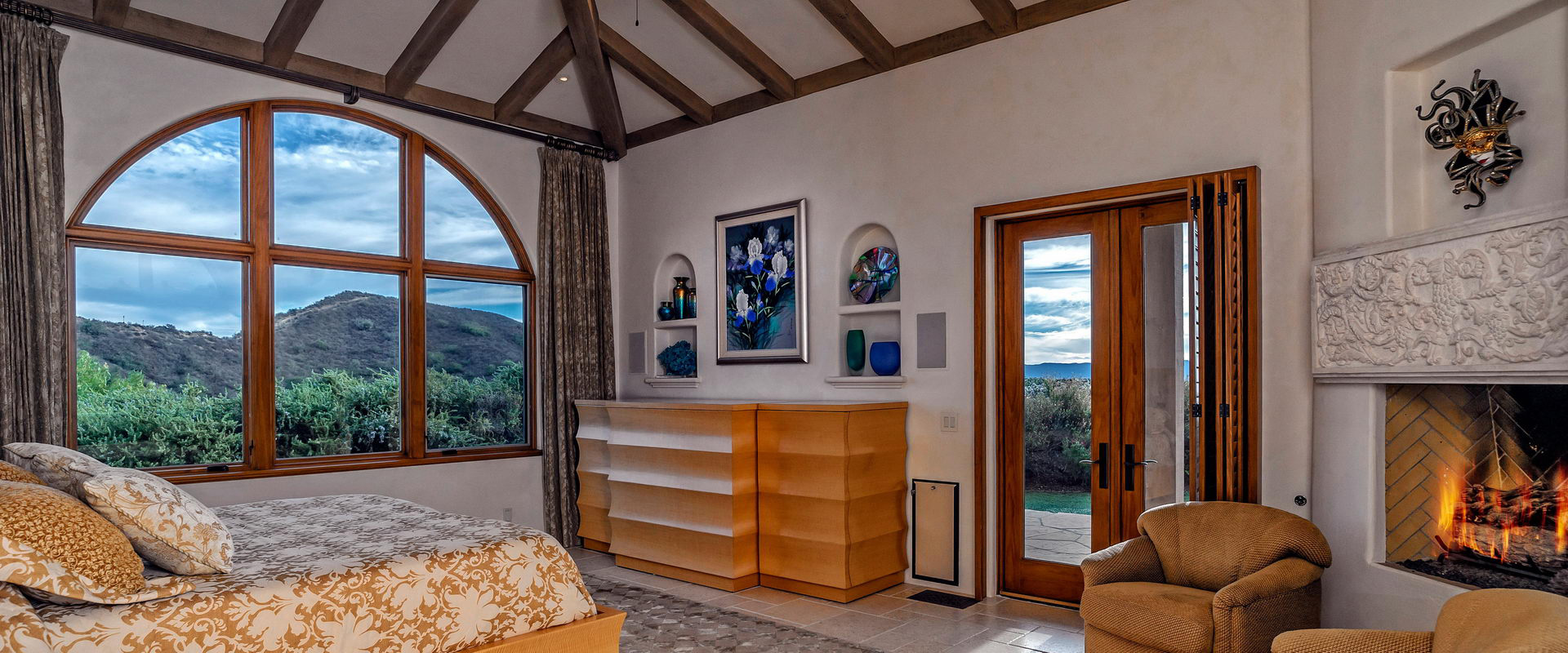 The home's design features a gourmet's center island kitchen with adjacent full service wine bar and family room that all benefit from exquisite arched top picture windows. French paver floors, radiant heat, high beamed ceilings, granite counters, top of the line appliances, skylights, and custom alder wood cabinetry all add to the beautiful interior of this home. A spacious, all weather, glass protected covered patio is conveniently accessed from the kitchen and formal dining room via tall, retractable glass doors, that overlook a tranquil, citrus lined atrium and refreshing solar heated lap pool.
